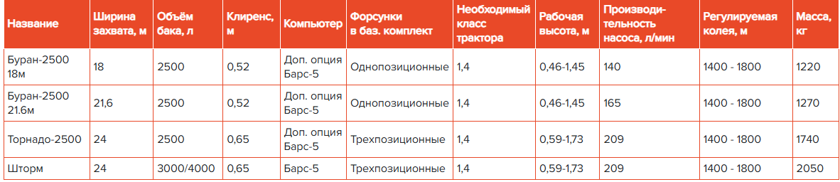 Прицепные опрыскиватели для химической защиты растений или внесения жидких удобрений представленны линейкой машин производства АО "ТАТАГРОХИМСЕРВИС". Выпускаются опрыскиватели с шириной захвата 18 или 21,6 м и объемом бака 2500 л (Буран-2500), 24м и объемом бака 2500л (Торнадо 2500) и объемом бака 3000/4000 л (Шторм 3000)